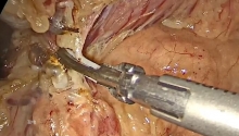 在作者的技术中,一旦作者的皮瓣被创建,作者专注于解剖Cooper韧带,就在耻骨联合的侧面。这将有助于识别腹膜前解剖结构。首先通过解剖内侧空间来识别Cooper韧带。这通常在解决疝气之前完成,因为它是一个有用的标志,特别是当疝囊很大并遮盖解剖区域时。一旦Cooper韧带被识别并且清晰可见,作者鼓励对腹膜前间隙进行横向解剖。这将确保更容易识别精索,输精管和其他重要结构(图3)。疝囊必须完全脱离精索,以避免疝气复发。如果大的阴窦疝可能会使夹层变得具有挑战性,可以将囊横切并留在原位,小心闭合腹膜缺损。如果已决定结扎囊,则囊的最窄点是最佳的,因为这将减小需要闭合的腹膜瓣中的缺损的大小。解剖完成后,可以将网状物放置在适当的位置。网状物的输送可以在对接机器人之前的程序开始时或者在床边通过8mm机器人套管针在适当的时间进行。当放置在手术开始时,作者将网状物和缝合线放置在骨盆入口处,在那里它是恒定的视图,但不在解剖的方式。当使用自粘网时,当直接缺陷较大时需要缝合固定。网状物跨越从耻骨结节到侧腹壁的空间,覆盖间接和直接缺陷。如果要进行固定,将不可吸收的缝合线或钉子放置在Cooper韧带和上腹壁上,位于上腹血管的内侧和外侧。必须小心且策略性地放置自粘网,以防止需要“取下”网状物并重新涂抹。作者更喜欢从Cooper韧带开始将网状物从内侧向外侧滚动。这确保了在定位时足够覆盖内侧空间。足够的覆盖率是关键,因为这可以减少复发(图4)。除了这种技术,可以用带倒勾的缝线封闭大的直接缺陷。这可以用于防止网格通过大缺陷而发生事故。
