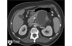 基本病史:55岁女性,左腰痛。腹部增强CT如下图所示。影像学特征:来源于胰体/尾部的巨大的分叶状的囊性肿块,包绕脾动脉。其内可见一致密物在病变的内部下方与其分层。脾静脉内形成血栓,导致明显的胃肝和胃脾静脉 ...