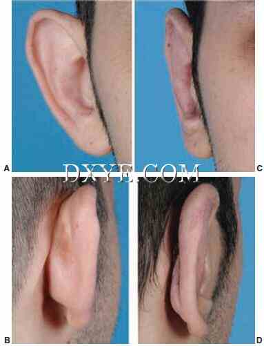 2. 皮肤切除术。皮肤切除是不必要的,不利于矫正,也可能导致肥厚或不良的疤痕。唯一的例外是耳垂,它可能是必要的。执行后者时,要注意清除皮肤够,毗邻小叶沟,允许重新定位和离开,穿耳和美学上正常无耳垂耳垂。