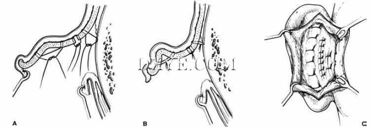 4. 缝线选择。作者回到单丝永久缝因为偶尔编织缝线肉芽肿如Mersilene相关。一个持久的单丝缝合如聚对二氧环己酮缝合可能是最好的选择,但作者这种缝合没有经验,因此不能做出可信的推荐。