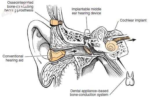 图-1. 概述各种植入式听力设备与听觉系统的接口。 常规辅助器械从管内放大,而骨整合的骨传导听力假体应用于耳后颅骨以通过骨传导提供听力。 同样,基于牙科器械的骨传导系统也提供听力。 可植入的中耳听力装置在小骨的水平面接口并绕过耳膜。 相反,人工耳蜗直接刺激耳蜗内剩余的神经元件。 (Courtesy Nikolas Blevins, MD.)