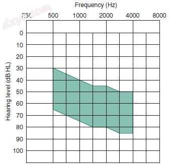 图-4. Soundbridge的听力学选择标准适用于中度至重度感音神经性听力损失为70 dB纯音平均听力阈值的患者。 该图的阴影区域对应于纯音测听植入物标准。 该装置的临床适应症为:(1)选择标准内的纯音导气阈值,(2)正常中耳解剖结构,(3)记录材料的词语识别得分为50% (4)没有回声螺旋或中央受累,(5)患者年龄≥18岁。 HL,听力损失。