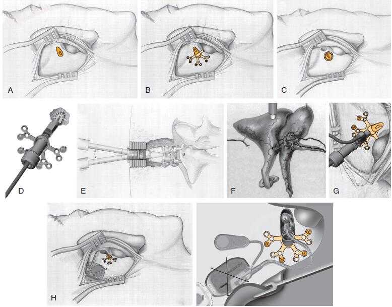 图-6. OTOlogics中耳换能器(MET)或Carina的外科植入开始于有限的造口术(A),其备用皮质骨架用于附着金属阶段(B和C),其用于稳定激光(D)以用于创建 (E)上的一个小洞。 激光被移除并用MET致动器替换,其顶端插入到砧骨切开(F)中。 致动器固定在台(G)上,植入装置的其余部分固定在后乳突皮质骨(H)上。 在该装置(I)的Carina完全植入式版本中,在覆盖乳突的皮肤下面的皮下麦克风替换MET中使用的外部麦克风和感应链路,但植入过程在其他方面是相似的。