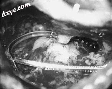 图-5. 拆分桥。砧骨桥用砧骨短突与水平半规管之间的0.5 mm金刚石钻分。在这种情况下,后砧骨韧带被处理。示出耳蜗植入电极放置在分割桥内;这将电极固定在适当位置,防止挤压,并将电极从管和鼓膜的钻孔暴露段引导,以防止其收缩。