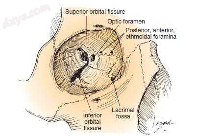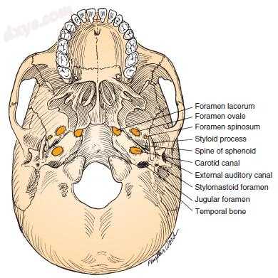 图-2. 脱臼颅骨显示神经颅与内脏颅交界处(颅颌面交界处)。前颅底形成眶顶和鼻腔,中颅底构成颞下窝、翼腭窝和鼻咽的顶部。前颅底和中颅底区域的手术入路常穿过内脏颅。