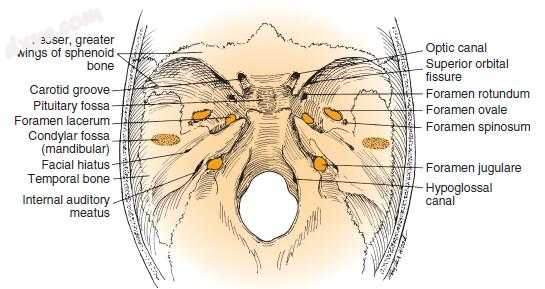 图-1. 显示颅底的颅内视图,显示前,中,后分界的边界。