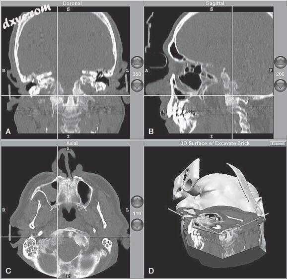 图-11. 术中计算机显示的导航图像。患者的CT图像显示在冠状面(A)、矢状面(B)和轴(C)和平面上;还示出三维剖视图(D)。在每个图像上,十字准线的交点指示导航探测器的位置。当探针在操作场内移动时,图像改变以反映探针的精确位置。在这种情况下,既有成骨细胞和溶骨性病变,并涉及枕骨髁内窥镜通过鼻腔接近,而不需要广泛的拆卸方法。该病变原来是来自先前肾细胞癌的转移。