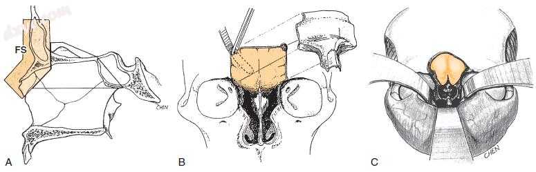 图-17. 如Raveh.71-73A所述,颅前入路进入前颅底,矢状位示意图显示截骨后根节段(FS),将其去除以允许进入更深的结构,并且随后被替换。 B,通过去除额骨骨段提供的初始暴露; 注意可延展的牵开器保护硬膜。 C,损伤摘除后的暴露程度; 蝶窦,蝶鞍和眶尖在伤口深处可见。 请注意,双角状头皮皮瓣已沿着外侧和内侧眶缘和鼻部相当广泛地升高以允许截骨截骨术并补偿进入前颅底的非常低的平面,同时避免面部切口。 (From Raveh J, Laedrach K, Ilzuka T, et al. Subcranial extended anterior approach for skull base tumors: surgical procedure and reconstruction. In Donald PJ, ed: Surgery of the skull base. Philadelphia: Lippincott-Raven; 1998.)