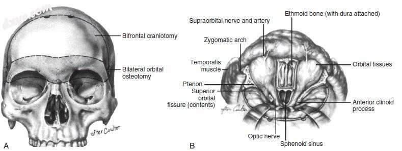 图-16. 颅底的基底前额入路。 A,双面开颅手术和双侧眼眶截骨术的概述。 B,外科医生从头顶部和眼眶骨段切除后的视野。 已经横断嗅神经以允许足够的大脑回缩以暴露前窝底和减少视神经。 蝶窦已被广泛开放。 (From Sekhar LN, Janecka IP. Intracranial extension of cranial base tumors and combined resection: the neurosurgical perspective. In Jackson CG, ed: Surgery of skull base tumors. New York: Churchill Livingstone; 1991.)