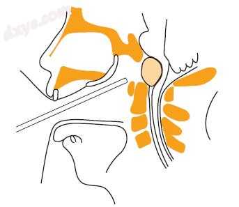 图-29. 颅底的经口入路显示通过开口进入颅颈交界处,软腭退缩。 浅橙色代表斜坡的肿瘤,伴随着脑干的压缩。 (From Crockard HA, Bradford R. Transoral transclival removal of a schwannoma anterior to the craniocervical junction. Case report. J Neurosurg 1985;62:293.)