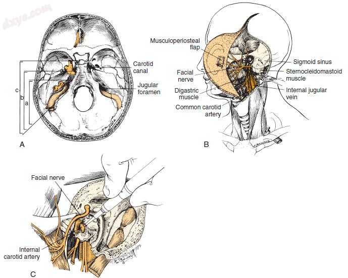图-32. 对颅底进行颞下入路。 A,颞下入路的各种变化可达到的颅底区域:a,颈静脉孔和岩尖; b,斜坡; c,蝶鞍旁的和副蝶骨隔间。 B,耳后的切口延伸到头皮和颈部。胸锁乳突肌和二腹肌已经在乳突尖处分开以允许进入颈动脉和颈内静脉。面神经已被确定为表外的;通过转动肌肉骨膜瓣关闭外耳道。 C,根治性乳突切除术暴露了已经结扎的乙状窦和中间的硬脑膜。鼓膜和小骨已被移除。面神经已经被解除了前移。通过渐进式钻孔,颈内动脉可以通过其岩端向远端追踪到达海绵窦。同样,额外的骨去除前方将允许进入鞍旁区域和鼻咽部。 (From Fisch U, Pillsbury HC, Sasaki CT. Infratemporal approach to the skull base. In Sasaki CT, McCabe BF, Kirchner JA, eds: Surgery of the skull base. Philadelphia: JB Lippincott; 1984.)
