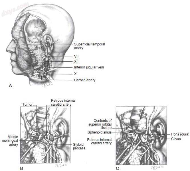 图-35. 颞下 - 前耳和颞下入路颅底。 A,初次曝露。 面神经的远端分支仅用于示范; 在大多数情况下,他们没有解剖。 额叶与皮瓣包括在一起,向下收回。 B,临时摘除颧弓后,颞肌下方反射(左下方),切除下颌骨髁,并进行颞下颌骨切除术。 在分割茎突复合体之后,颈动脉在颞骨内的一部分过程中向远侧追踪以将其与肿瘤分开。 面神经不需要调换,中耳的传导机制在此方法中保持不受干扰。 C,逐渐解剖暴露斜坡,蝶窦,上眶裂,以及相邻的神经和血管结构。 (From Sekhar LN, Janecka IP. Intracranial extension of cranial base tumors and combined resection: the neurosurgical perspective. In Jackson CG, ed: Surgery of skull base tumors. New York: Churchill Livingstone; 1991.)