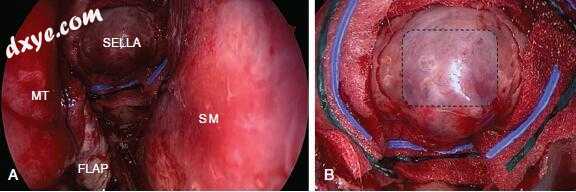 图-17. A,经间隔的 /经鼻方法的内窥镜视图。 左侧鼻中隔粘膜(SM)保持完整,鼻中隔瓣右侧收获并位于鼻咽腔内。 MT,中鼻甲。 B,四角硬膜切口的示意图。