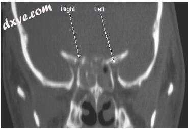 图-19. 冠状面计算机断层扫描显示视神经管的双侧骨折。