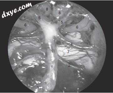 图-9. 去除蝶窦,蝶鞍,蝶骨平面和斜坡后壁后,前后窝的内镜观:1,基底动脉; 2,颈内动脉; 3,视神经和视交叉; 4,脑下垂体和垂体柄; 5,脑干; 6,颅神经VI; 7,海绵窦及其内容物(颅神经III,IV,V和VI); 和8,椎动脉。 (Courtesy T. Scopel.)