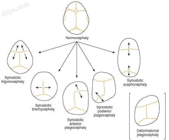 图-1. 在颅缝早闭患者中,可防止融合缝合线的生长。 箭头显示了开放缝合线发生的持续颅内扩张的补偿性增长。 (From Cohen MM Jr, Maclean RE. Craniosynostosis: diagnosis, evaluation and management, ed 2. New York: Oxford Press; 2000:122.)