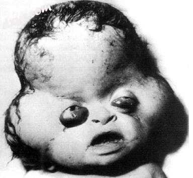 图-11. 所有的颅骨缝线的过早融合,除了跖缝和鳞缝导致kleeblattschädel,或苜蓿叶颅骨。 (From Cohen MM Jr, Maclean RE. Craniosynostosis: diagnosis, evaluation and management, ed 2. New York: Oxford Press; 2000.)
