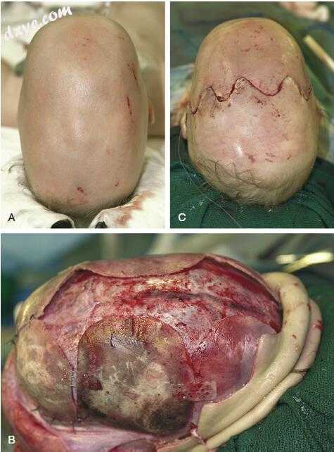图-20. 舟状头(畸形)修复。 A,严重头颅的术前观察。 B,修复所需的总颅穹窿重塑 - 每侧的颞顶骨复合体被破坏。 注意结合使用可再吸收的缝线和板以获得稳定的构造。 C,术后观。