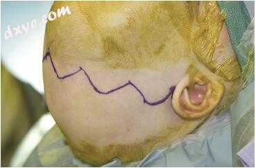 图-18. 一个4个月大的波状双线切口,有舟状头畸形和矢状面骨性关节炎。 术后5个月显示切口的优秀伪装。 经过双顶冠状切除术和羊羔楔形颅骨切除术,额叶和顶骨的枪管,以及术后模塑头盔3个月后,头部指数也有所改善。
