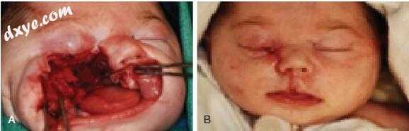 图-33. 1个月大的人正在进行面部分离治疗颅底肿瘤。 A,术中和(B)术后观。