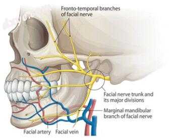 面部骨骼修复术后面神经麻痹不常见,但可引起明显的持续症状,如眉毛下垂和口角不对称。时间分支特别容易受到损害,因为它是终端分支并且与其他分支相比具有较少的通信。因此,在颧弓解剖和截骨术中应尊重面神经的颞支。通过往复锯或在通过摆动锯进行下颌骨修整期间或在通过电烙术止血期间,可以在颏成形术期间损坏边缘下颌骨分支。因此,外科医生应注意,以免在这些手术过程中损伤边缘下颌支。