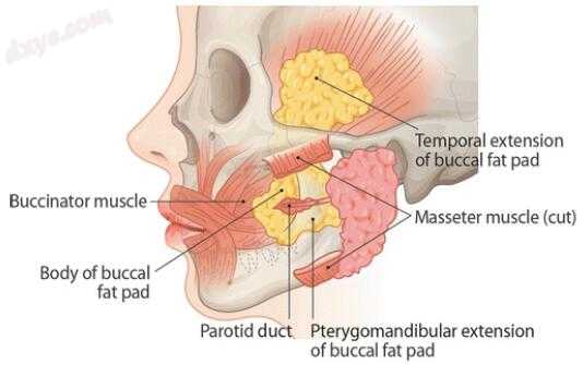 颊脂垫包括一个主体和四个延伸:颊,翼,浅表和深颞。身体位于中央位置。颊侧延伸位于脸颊内,翼状和颞侧延伸位于更深处。