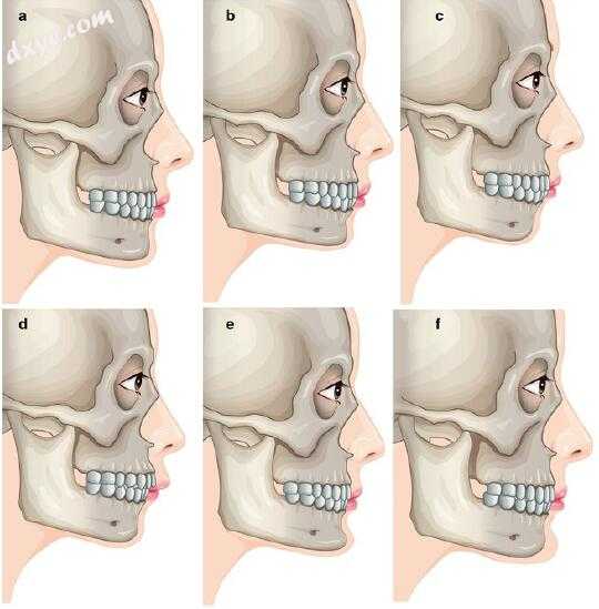 图8.1下巴畸形的分类。 (a)正常下巴,(b)小颏,(c)颏部后缩,(d)假退变,(e)巨颏,(f)假巨颏