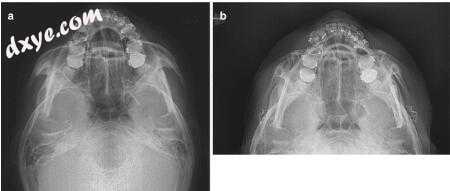 图16.7病例1.(a)术前和(b)术后放射照相显示颧骨后内侧重新定位