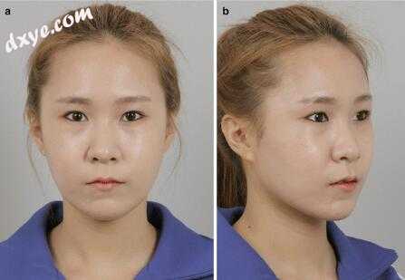 图16.9病例2.术前(a)额叶和(b)斜照片。 减少颧骨成形术和下颌骨减少术同时进行