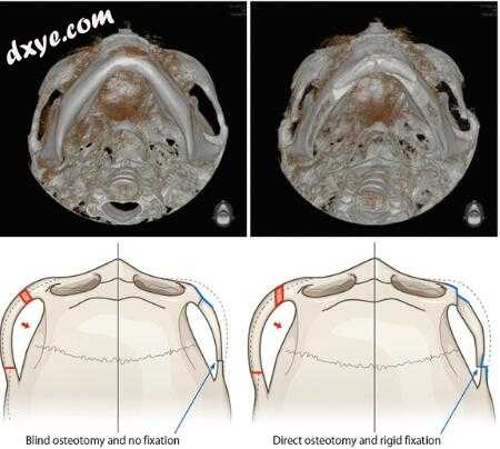 图21.1(左)盲截骨,无颧弓固定。 (右)直接截骨和颧弓的刚性固定