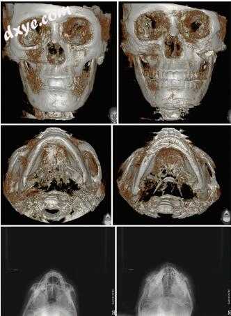图21.5(上方和中间,左侧)术前三维CT扫描。 (上方和中间,右侧)术后三维CT扫描。 (左下图)术前基底颅骨X线片。 (右下图)术后基底颅骨X线片