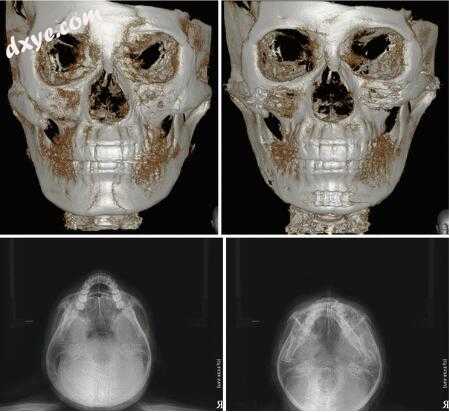 图21.6(上图,左图)术前三维CT扫描。 (上,右)术后三维CT扫描。 (左下图)术前基底颅骨X线片。 (右下图)术后基底颅骨X线片
