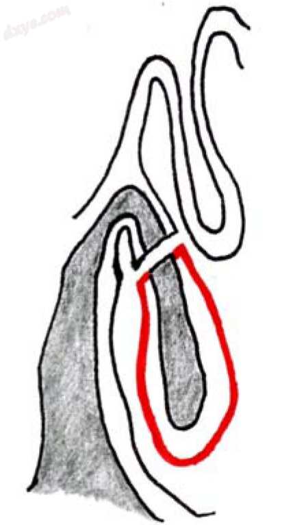 泡状鼻甲内侧还有粘膜和排水管,通过自己的自然口进入筛骨漏斗。由于其具有许多隔膜和腔室,它可以实现相当大的尺寸,并且可以在与隔膜和/或漏斗部接触时导致阻塞。粘膜和海绵状实质的体积比下鼻甲的情况要小[12]。强烈血管化的粘膜在加湿空气和净化吸入空气中起着重要作用[13]。