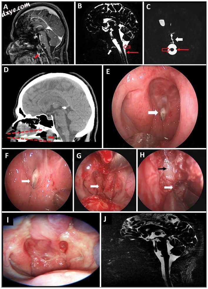 A. Sagittal T2 MRI显示脑脊液瘘(红色箭头)。 B.术前矢状MRI脑池造影显示CSF瘘(白色箭头),椎管(实心箭头)和脊髓(透明箭头)。 C.术前轴位MRI脑池造影显示CSF瘘管(白色箭头),脊髓管(实心箭头)和脊髓(透明箭头)。 D.矢状CT显示可能的SMD探针轨迹。 E.内窥镜检查瘘管(白色箭头)。 F. Valsalva动作期间的Fistulous道与CSF涌出(白色箭头)。 G.后切除术后抬高鼻中隔皮瓣的图像。 H.中线鼻咽组织解剖显示下颅(黑色箭头)和瘘管(白色箭头)从颅颈交界处左侧中线看到。 I,J。术后内镜和MRI图像显示瘘管的分辨率和鼻中隔皮瓣的完全愈合。