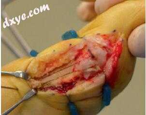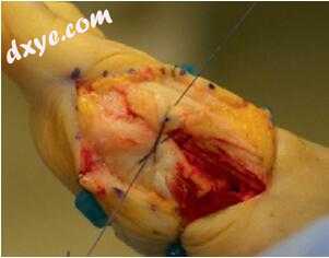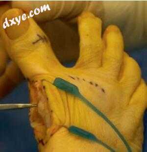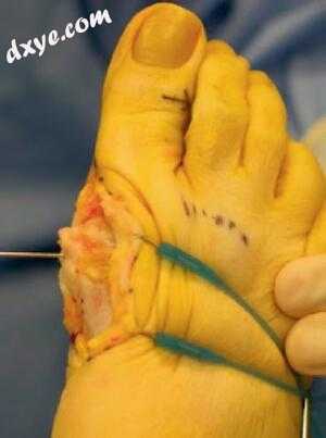 图12.26位于背侧第一跖骨的顶端轴导向器有助于定位切口; 当背部手臂切断完成时,拇趾的直接收缩和被动背屈被用于保护肌腱