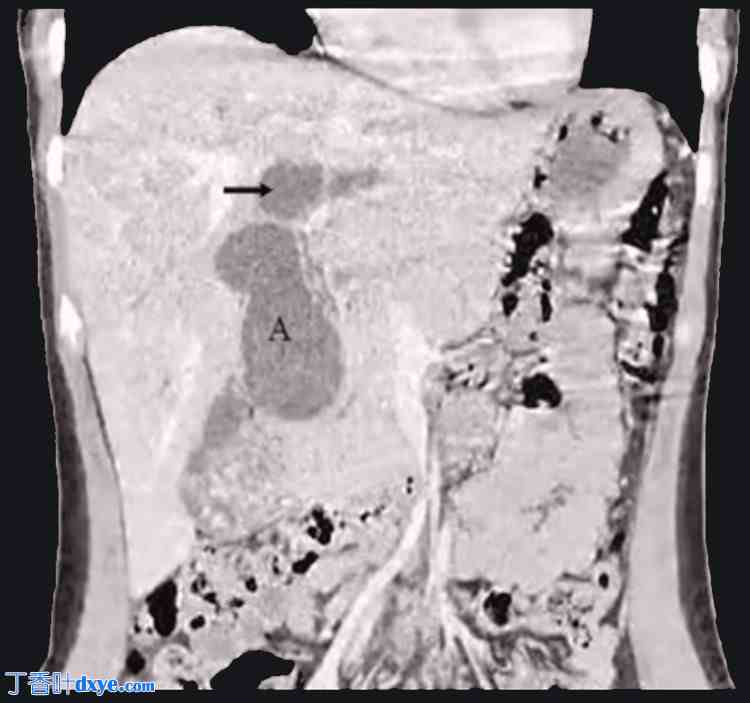 该胸腹冠状切面显示肝内外胆管均有明显扩张。从十二指肠上部到肝总管(箭头)均观察到扩张的胆总管 (A),以及左肝管和右肝管。